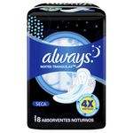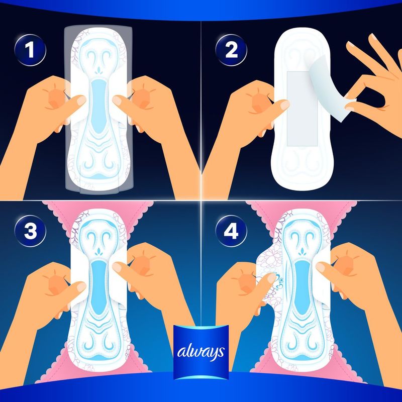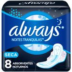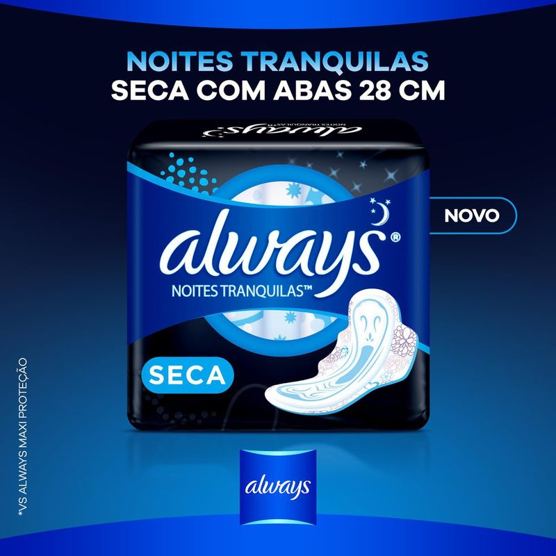 Durma sem preocupações e descanse agradavelmente com os novos absorventes Always Noites Tranquilas com cobertura Seca, desenhado para dormir a noite toda. Always Noites Tranquilas Seca tem melhor ajuste a calcinha e uma estrutura fina para melhor conforto. Sua cobertura de malha absorve instantaneamente para até 0% de vazamentos*.