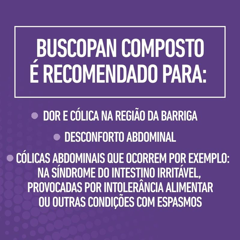 BUSCOPAN COMPOSTO é indicado para o tratamento dos sintomas de cólicas intestinais, estomacais, urinárias, das vias biliares, dos órgãos sexuais femininos e menstruais.
