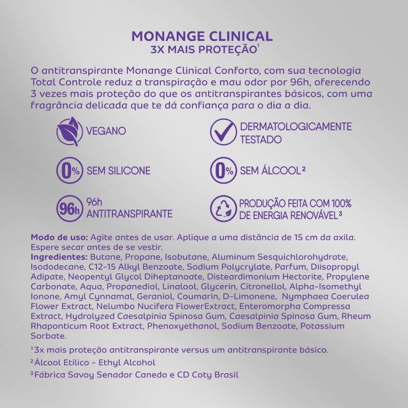 O novo Desodorante Monange Clinical Conforto foi desenvolvido com máxima proteção para as suas axilas, com tecnologia Total Controle que oferece 3 vezes mais proteção que os antitranspirantes comuns. Com fragrância delicada e cremosa, Monange Clinical Conforto oferece até 96 horas de proteção para mulheres que não abrem mão da segurança e conforto no dia a dia. Testado dermatologicamente, o antitranspirante não possui álcool e silicone em sua fórmula.