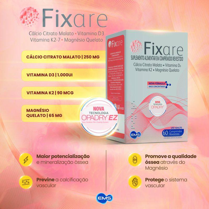 Fixare Suplemento Vitamínico é composto por nutrientes essenciais cálcio, vitamina D3 e vitamina K2 que desempenham um papel importante no desenvolvimento e na manutenção dos ossos.