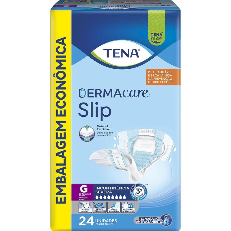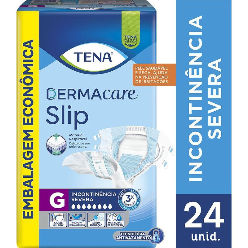 Fralda TENA Dermacare possui dupla camada e um núcleo de alta absorção que rapidamente retém a urina promovendo segurança em um produto hipoalergênico. Com tecido macio e respirável que permite a respiração da pele mantem a mesma sempre seca e saudável, ajudando a prevenir irritações. Possui tecnologia antivazamento com barreiras protetoras, elásticos nas costas e controle antiodor. Indicada para incontinência urinária e fecal em usuários com pouca ou nenhuma mobilidade. Proteção e cuidado para a pele todos os dias. • Tamanho: G (92 - 144 cm) • Referência: 70-90 kg