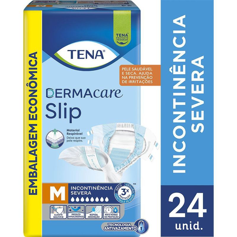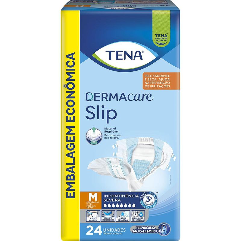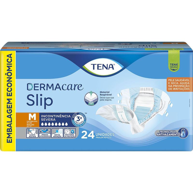 Fralda TENA Dermacare possui dupla camada e um núcleo de alta absorção que rapidamente retém a urina promovendo segurança em um produto hipoalergênico. Com tecido macio e respirável que permite a respiração da pele mantem a mesma sempre seca e saudável, ajudando a prevenir irritações. Possui tecnologia antivazamento com barreiras protetoras, elásticos nas costas e controle antiodor. Indicada para incontinência urinária e fecal em usuários com pouca ou nenhuma mobilidade. Proteção e cuidado para a pele todos os dias. • Tamanho: M (73-122 cm) • Referência: 40-70kg