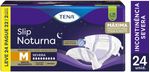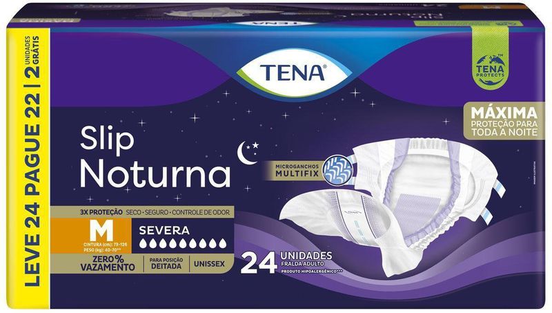 Fralda Geriátrica Descartável TENA Noturna é uma fralda unissex para usuários com pouca ou nenhuma mobilidade (acamados), indicada para incontinência severa. Proporciona máxima proteção durante toda a noite. • Possui um sistema de fechamento Multifix – que permitem ajustar o produto quantas vezes forem necessárias sem danificá-lo, garantindo uma adaptação segura e confortável ao corpo. • Possui controlador de odor e um núcleo de rápida absorção e elásticos nas costas – posicionados para dar segurança na posição deitada, além de barreiras protetores e uma camada de polpa dupla que mantem a urina longe da pele, mantendo-a seca, reduzindo significativamente o risco de irritações ou infecções cutâneas. • Zero % vazamento, eficácia comprovada por testes em laboratório e com usuários do produto – até 12h de proteção. • Cobertura Externa - Similar ao tecido, que proporciona suavidade e menos ruído, com melhor circulação de ar e sensação de frescor; com aloe vera.