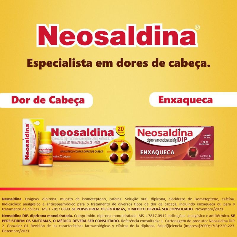 Neosaldina Dip é um medicamento à base de dipirona, utilizado no tratamento da dor e febre. Tempo médio de início de ação: 30 a 60 minutos após a administração e geralmente duram aproximadamente 4 horas.