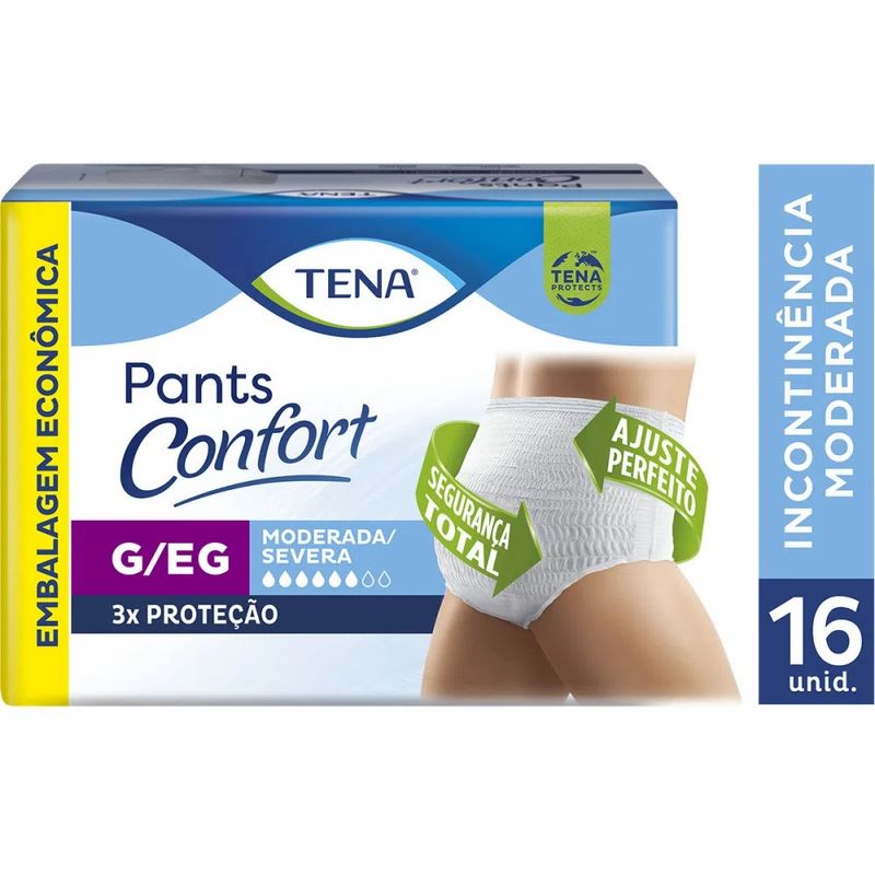 Roupa Íntima Descartável TENA Pants Confort é uma roupa íntima descartável e unissex de rápida absorção, proporcionando ao usuário ativo ou com pouca mobilidade facilidade de uso, discrição e segurança. É indicado para perdas de urina moderada a severa. • Núcleo de Ultra Absorção Acquidry; • Odour Neutralizer™ - Sistema que neutraliza o risco de odores indesejáveis; • Material Macio - suave ao contato com a pele; • Mais elásticos em volta da cintura permitindo uma adaptação perfeita ao corpo; • Elásticos duplos nas pernas para um melhor conforto e segurança contra vazamentos; • Costuras laterais removíveis para retirar o produto com maior facilidade.