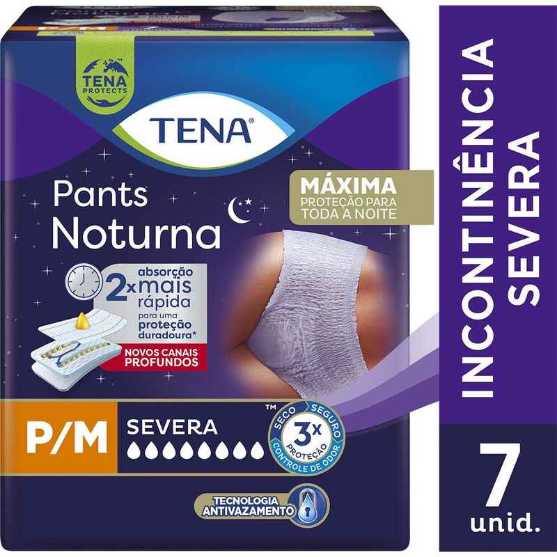 Roupa Íntima Descartável TENA Pants Noturna é uma roupa íntima descartável e unissex de rápida absorção, proporcionando ao usuário máxima proteção durante toda a noite. É indicado para pessoas com mobilidade e com perdas de urina severa. Além disso, é muito confortável (elásticos suaves em volta da cintura permitindo uma adaptação perfeita ao corpo), segura e de fácil uso, como uma roupa interior (calcinha ou cueca). A excepcional segurança deve-se à sua tecnologia antivazamento, que tem um núcleo de alta absorção - posicionado para também dar segurança na posição deitada, que absorve rapidamente grandes quantidades de urina mantendo-a longe da pele, assim o usuário permanece seco , reduzindo significativamente o risco de irritações ou infecções cutâneas.