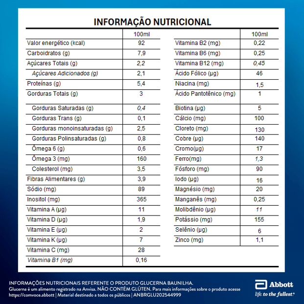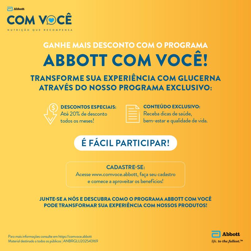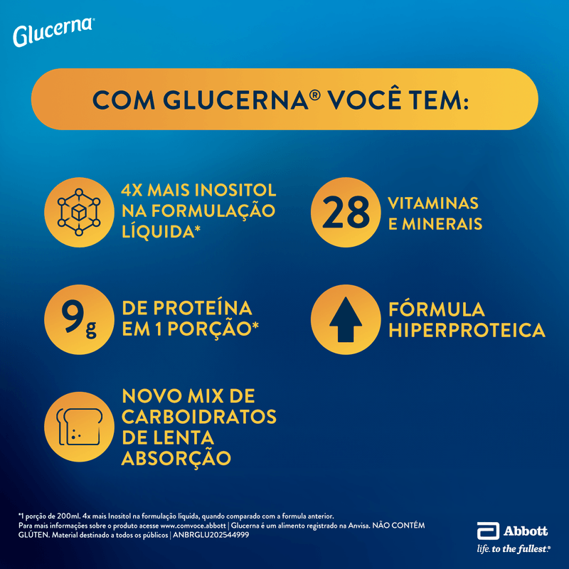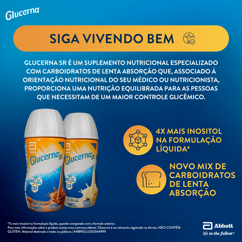Glucerna é um suplemento alimentar para quem busca manter energia no seu dia-a-dia e controlar os níveis de glicemia no sangue. Isso porque ele possui exclusivo carboidrato de lenta absorção, diminuindo os picos de glicose no sangue, contribuindo também para a saciedade. É livre de sacarose e glúten, e sua forma líquida é uma opção mais prática, pronta para beber a qualquer momento.