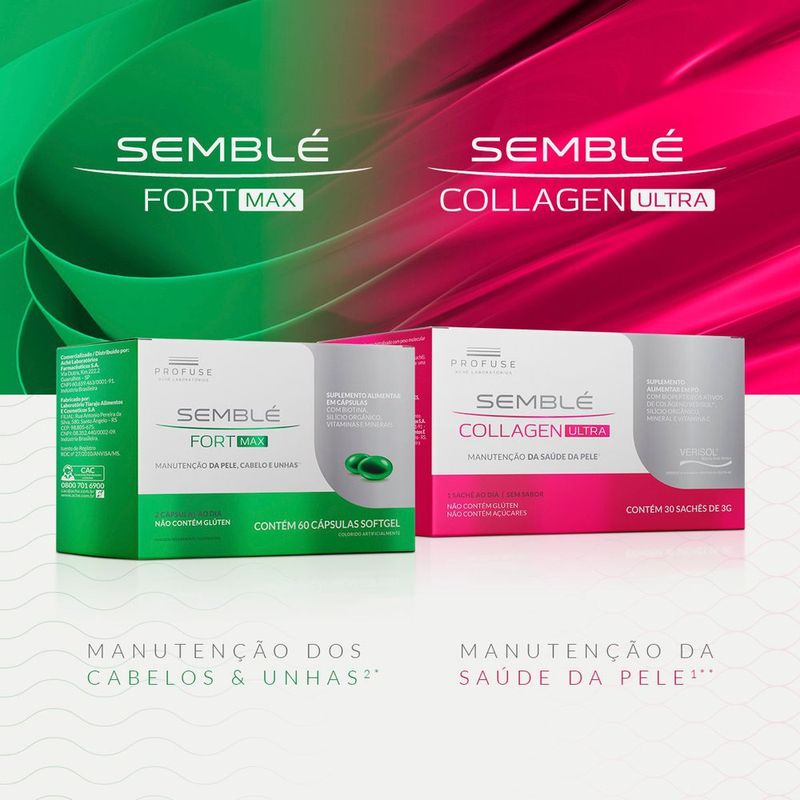 O Suplemento Vitamínico Semble Fort Profuse é indicado para auxiliar nos cuidados com a saúde dos cabelos. O produto possui ativos que agem no couro cabeludo, contribuindo para a nutrição e crescimento saudável dos fios. Instruções de uso na bula. Embalagem com 30 cápsulas Softgel.