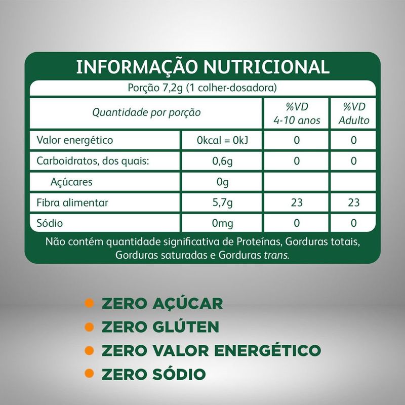 Auxilia no bom funcionamento do intestino. Contém fibras e Psyllium. Pode ser acrescentado em alimentos e bebidas. Zero açúcares, valor energético, glúten e sódio. Sabor laranja.